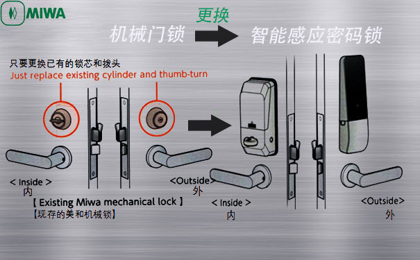 如果我們家里已經(jīng)是用的MIWA美和鎖,我想把入戶門鎖換成感應(yīng)密碼鎖,可不可以呢?回答是肯定的,只需要換鎖芯旋鈕就可以了,一把新型的感應(yīng)密碼入戶門鎖就組成了,它將牢牢地守住咱們溫暖的家。